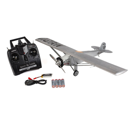 The Spirit of St. Louis 4-channel comes fully assembled as an RTF (Ready-To-Fly), so everything needed to fly is included in the box. In addition to the scale airframe with the installed 3-in-1 control board and separate 2.5g aileron servo, you get a 2.4GHz transmitter that includes the Rage RC PASS (Pilot Assist Stability Software) system so that the capabilities of the airplane grow as your flying skills increase. Even a USB charger that conveniently charges the included 1S 400mAh LiPo battery, and AA batteries for the transmitter are included in the package. All you need to do is charge the on-board battery and install the transmitter batteries and you'll be making your maiden flight on this amazingly detailed, historic airplane within minutes of opening the box!
