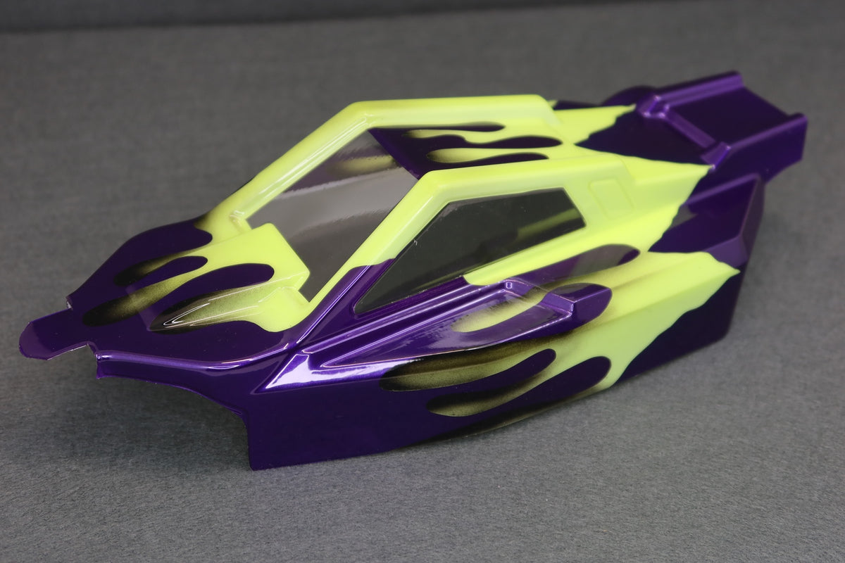 It is professionally custom airbrush painted for Rotor Ron by Bryan Johnston. He has many years experience painting bodies and does awesome work, this is no exception. His skills were put to the test and the end result is nothing short of amazing! This body will turn heads and make you stand out from the crowd and also allow you to see your car on track easier. The pics do not do the paint work justice.