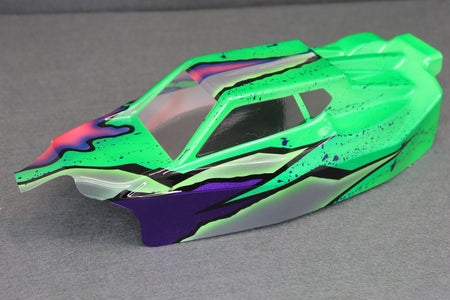 It is professionally custom airbrush painted for Rotor Ron by Bryan Johnston. He has many years experience painting bodies and does awesome work, this is no exception. His skills were put to the test and the end result is nothing short of amazing! This body will turn heads and make you stand out from the crowd and also allow you to see your car on track easier. The pics do not do the paint work justice.